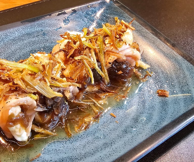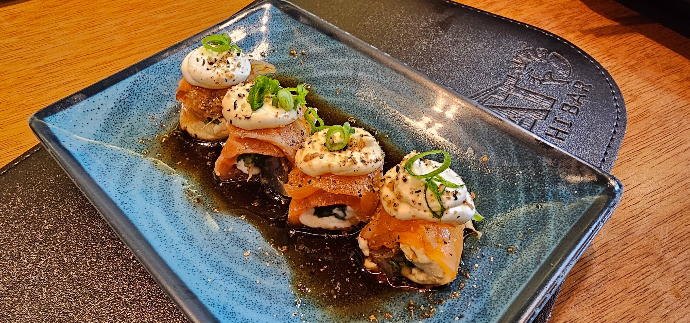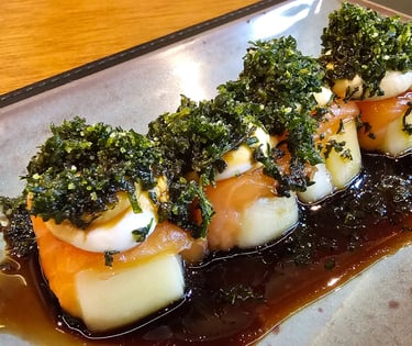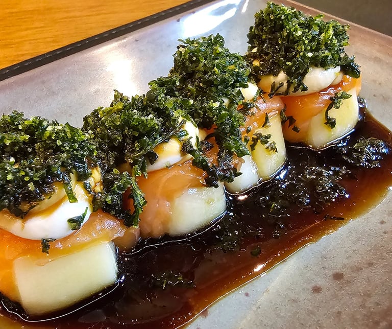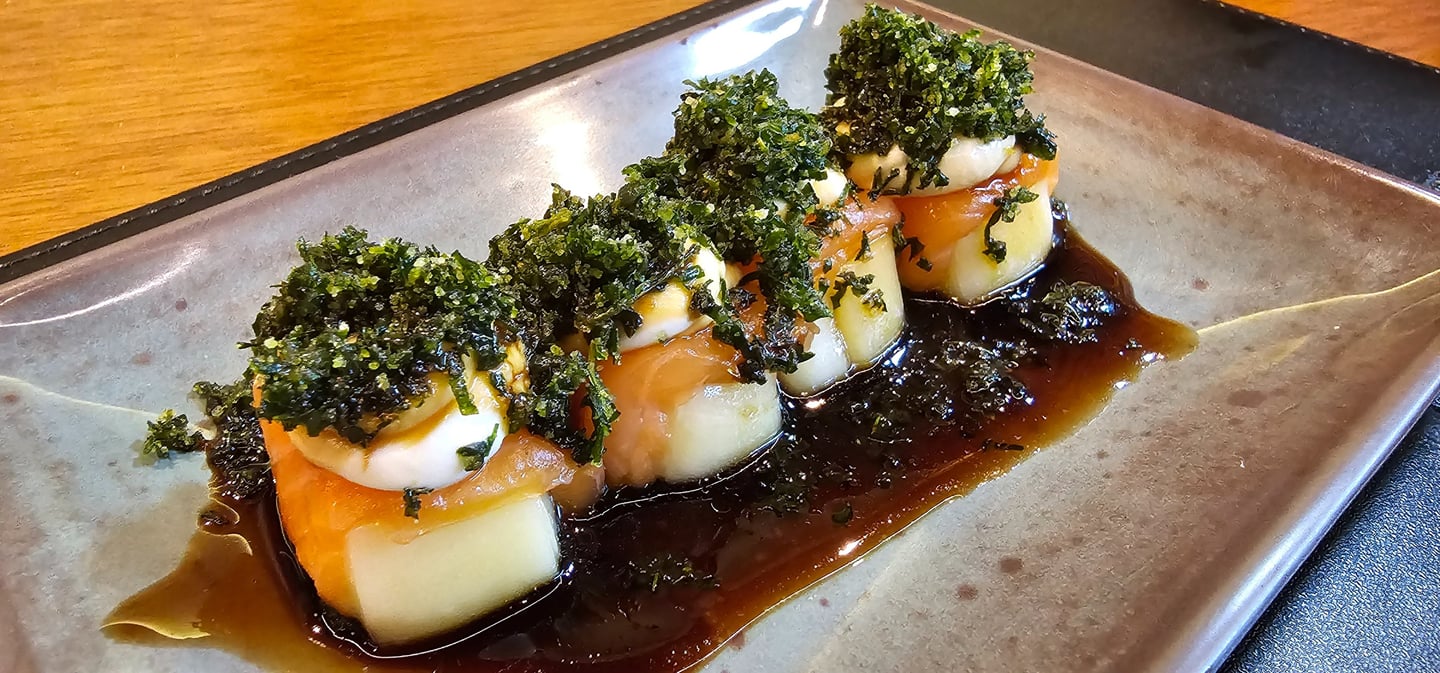Enrolado de salmão recheado com cream cheese, coberto com cebola caramelizada e flambado em um delicioso molho chef. Além de sua combinação única de sabores, este sushi alcançou a excelência ao apresentar uma textura perfeitamente equilibrada.